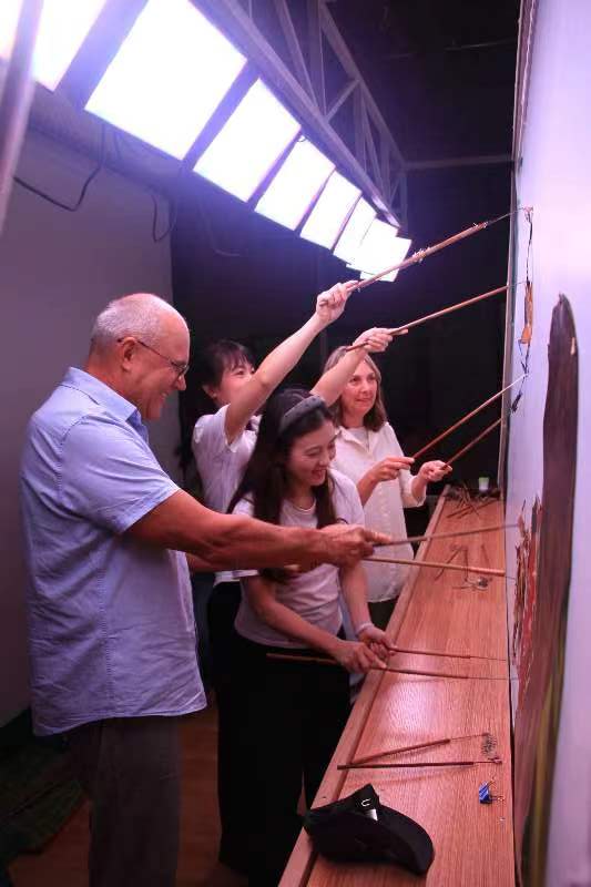 走进陆丰皮影戏博物馆,外籍友人们了解了陆丰传统皮影戏的历史与发展。在非遗工作坊,他们近距离观摩皮影牛皮制作雕刻的精湛技艺,从选材、雕刻到上色,每一道工序都凝聚着匠人的心血与智慧。随后,在皮影剧院,外籍友人们欣赏了经典皮影戏《龟与鹤》《鸡斗》以及杖头木偶戏《盛世藏行》选段。灵动的影人、激昂的唱腔、诙谐的剧情,让观众们仿佛置身于一个奇幻的童话世界,赢得阵阵掌声。互动环节中,外籍友人们更是亲自上台,在传承人的耐心指导下,纷纷尝试操纵影偶,感受“十指演绎千古事”的独特乐趣。与传承人共同演绎皮影戏,亲身感受中国传统文化的魅力。现场欢声笑语不断,成就感满满。